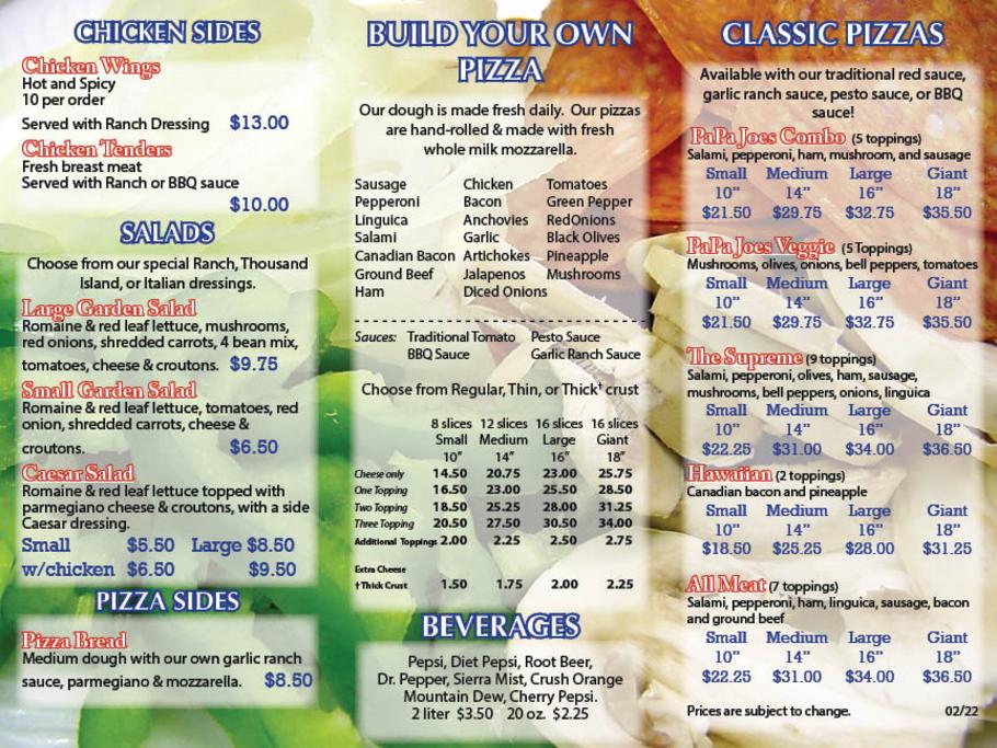Pay by credit card to. Papa Joes was established in 1982 by the Lorenzo family. DELIVERY CARRYOUT LOCATIONS ARE OPEN.